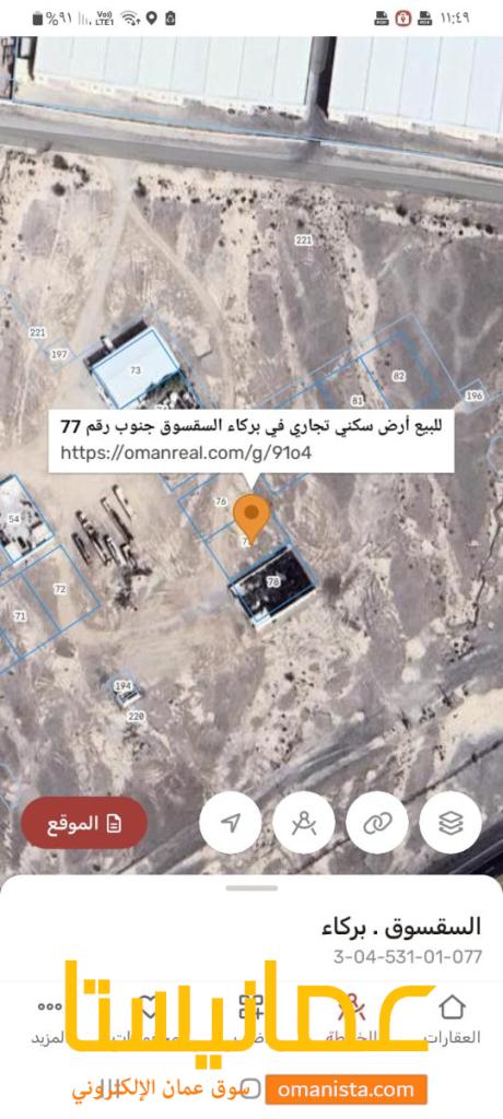 _ للبيع أرض سكنية تجارية وسطية ، في بركاء في السقسوق جنوب ، رقم القطعة ( 77) .