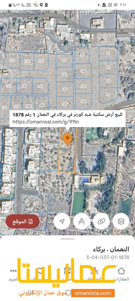 _ للبيع أرض سكنية ممتازة ، في بركاء في النعمان المرحلة الأولى ، رقم القطعة ( 1878) .