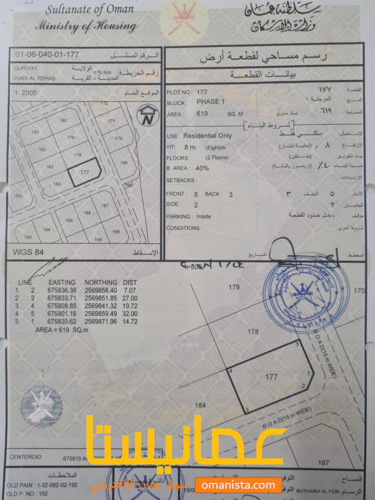 ارض للبيع في ولاية قريات منطقة عرقي وادي الرحاب . المساحة 619 رقم الأرض 177 المرحلة الأولى، الأرض كورنر ومستوية وقابلة للبناء الفوري ، جنبها العديد من البيوت القائمة.