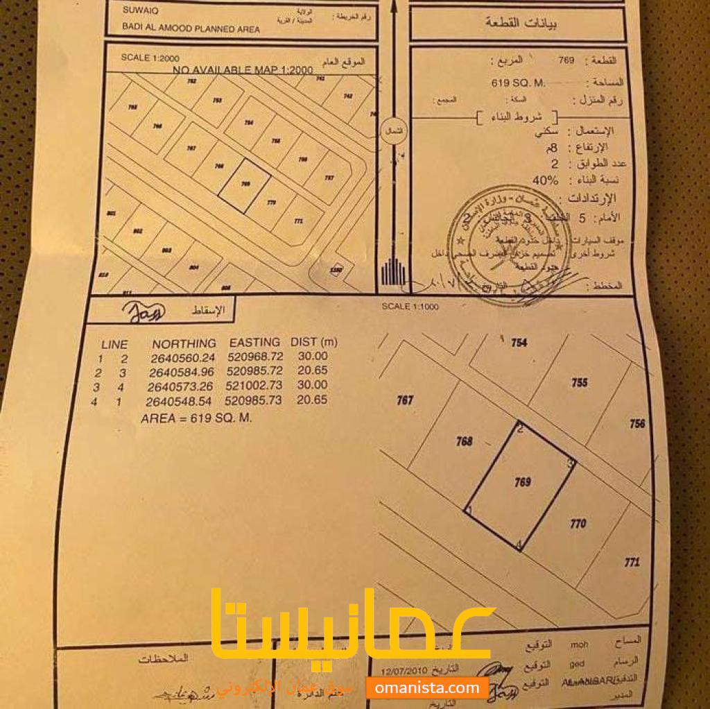 للبيع ارض سكنية ممتازة في السويق بدي العمود وسطية، رقم القطعة (769) .