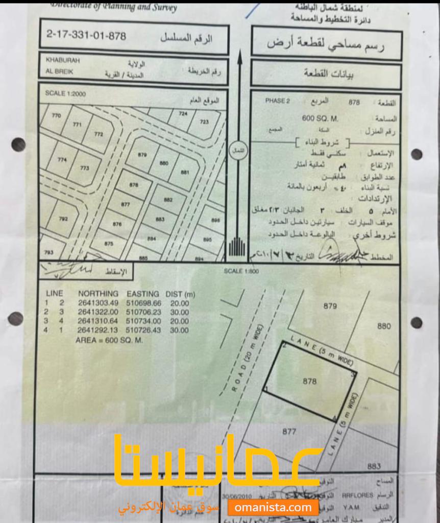 للبيع ارض سكنية ممتازة في الخابورة البريك مخطط 331 زاوية ، رقم القطعة (878) .