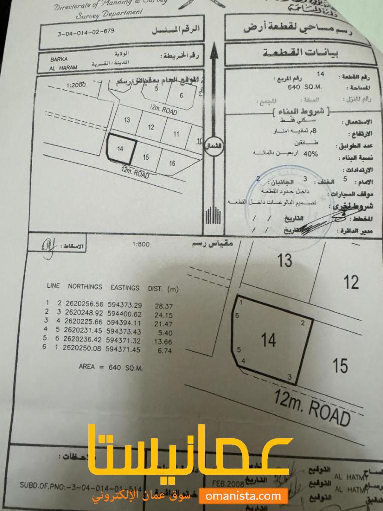 للبيع ارض سكنية ممتازة في بركاء الهرم ، رقم القطعة (14) .