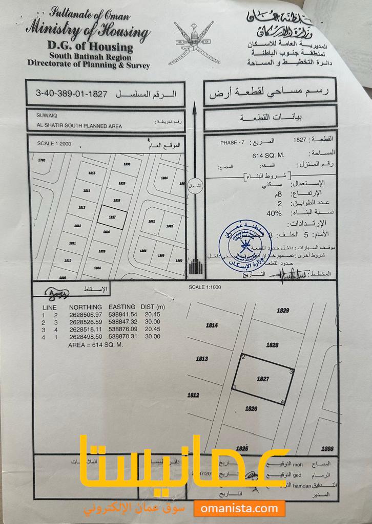للبيع ارض سكنية ممتازة في السويق الشاطر السابعة وسطية، رقم القطعة (1827) .