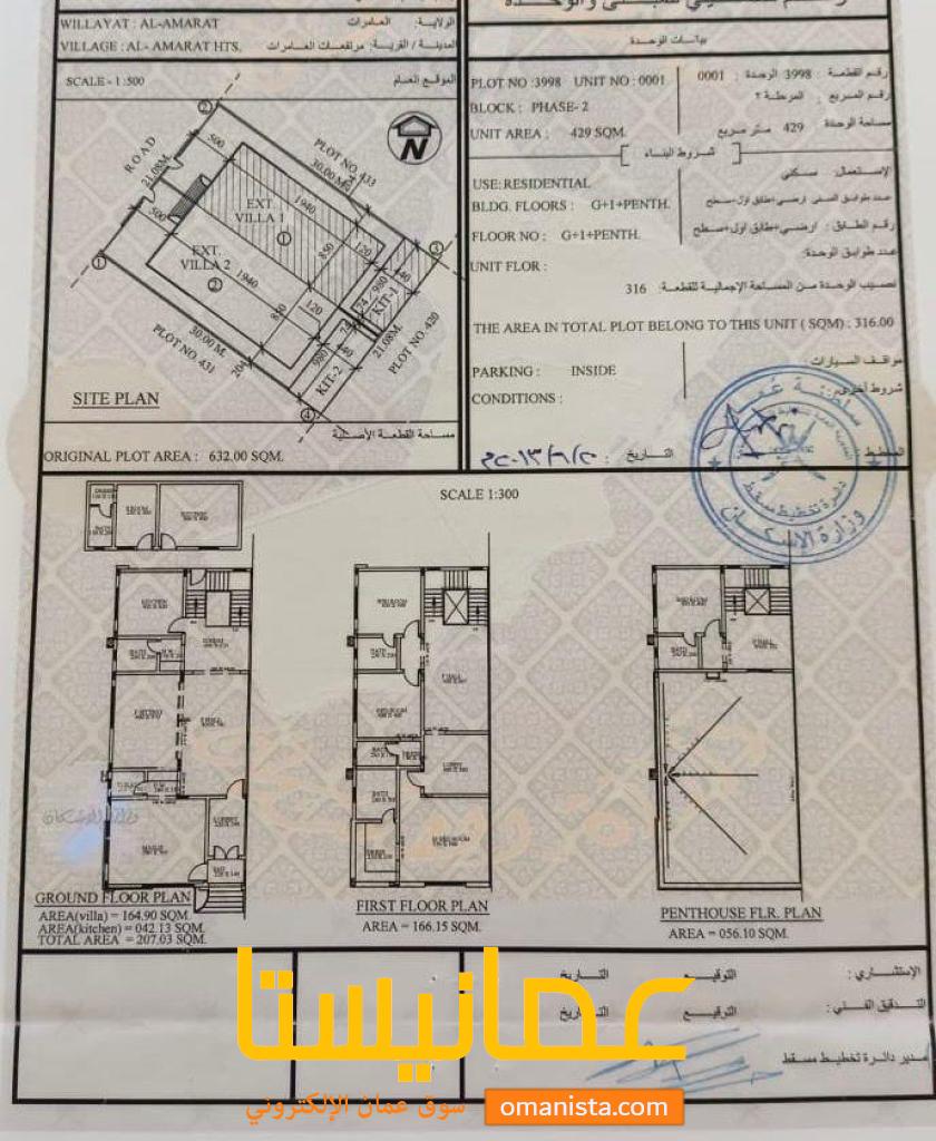 مساحة الأرض: 316م² ، مساحة البناء: 429م² .