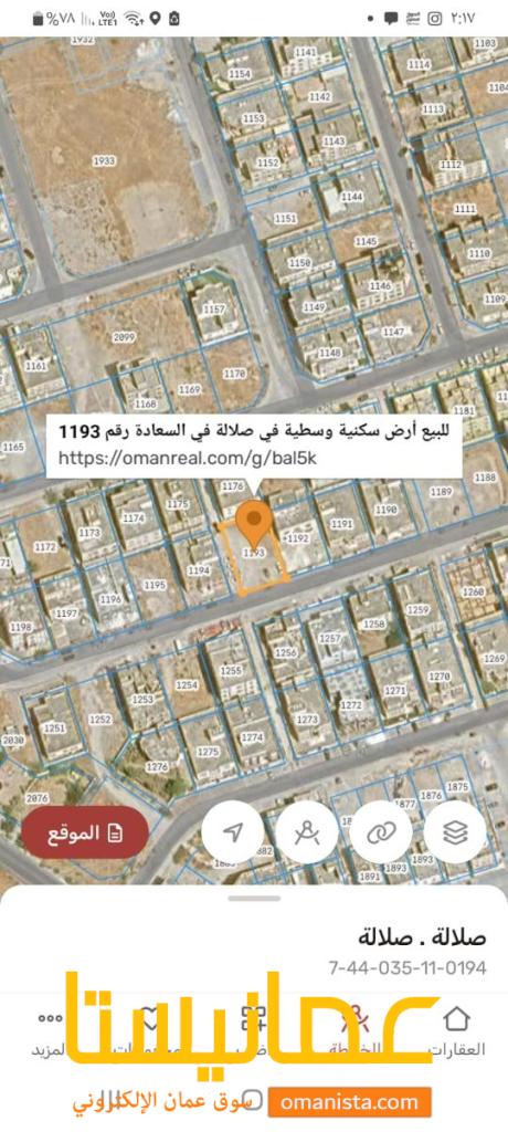 _ للبيع أرض سكنية وسطية ، في صلالة في السعادة ، بالقرب منهآ منازل قائمة ، رقم القطعة ( 1193)
