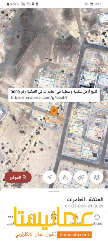 _ للبيع أرض سكنية وسطية ، في العامرات في العتكية ، بالقرب منهآ منازل قائمة ، رقم القطعة ( 3009)