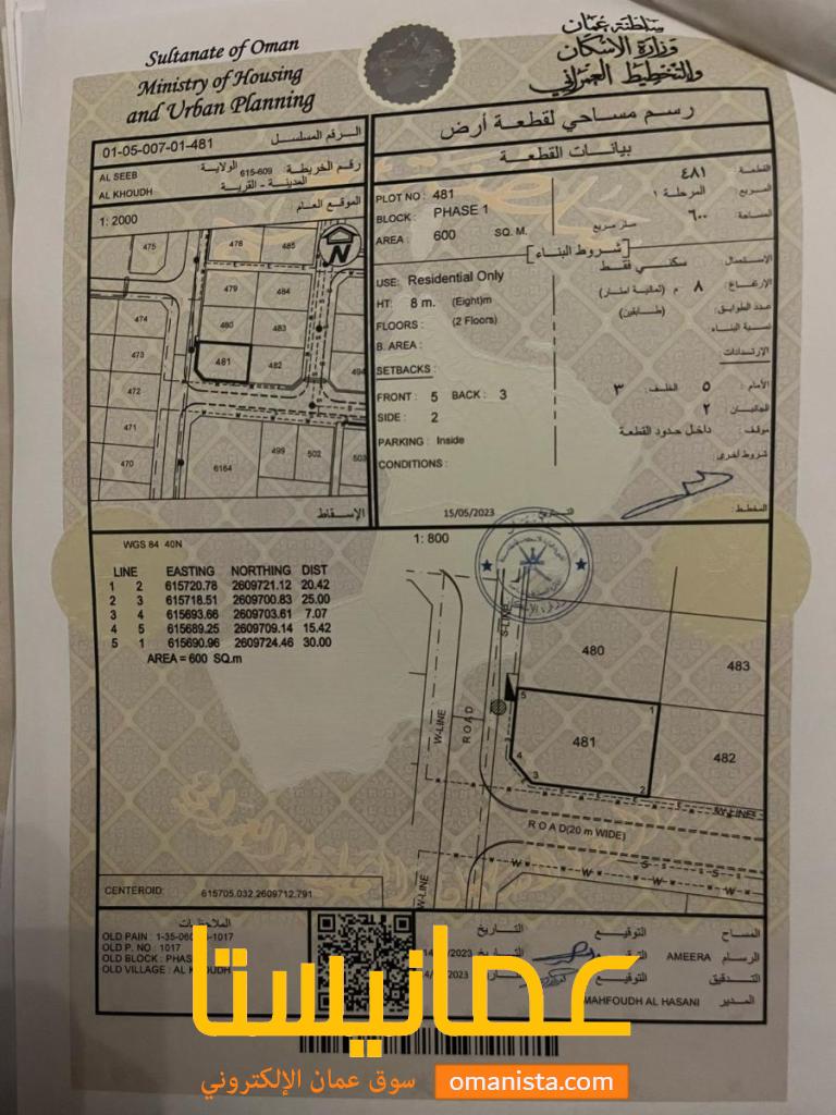 للبيع ارض سكنية ممتازة في السيب الخوض السادسة كونر، رقم القطعة (481) .
