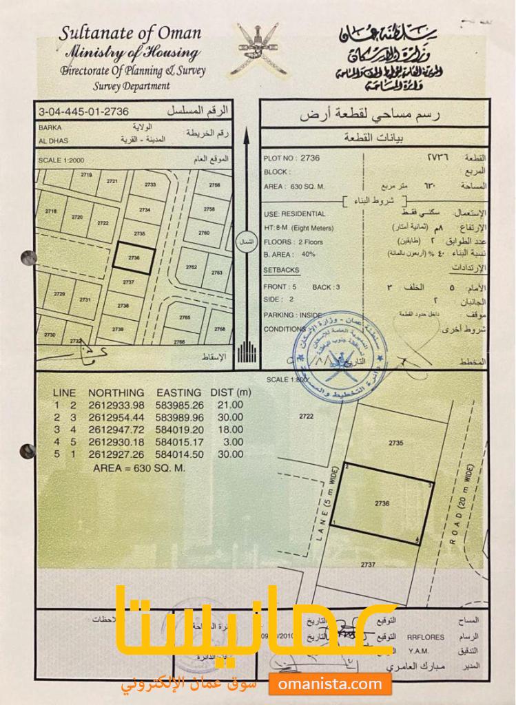 للبيع ارض سكنية ممتازة في بركاء الدهس الجديدة وسطية ، رقم القطعة (2736) .