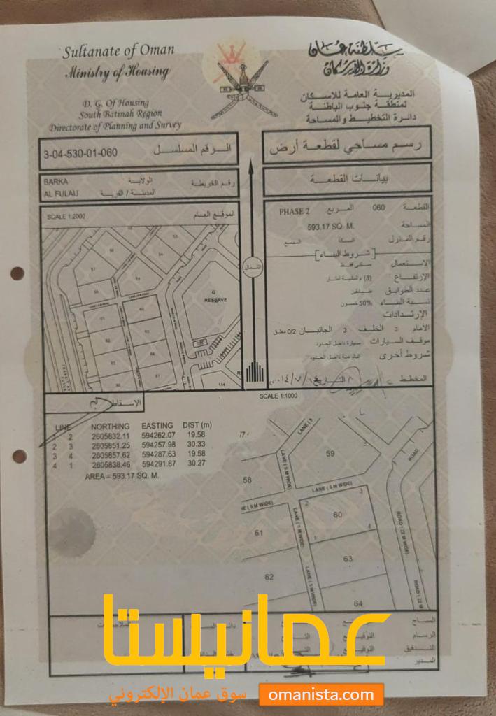 للبيع ارض سكنية ممتازة في بركاء الفليج 2 ، رقم القطعة (60) .