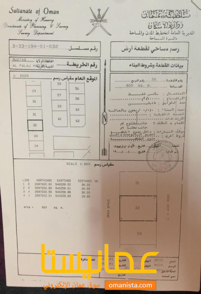للبيع ارض سكنية ممتازة في الرستاق قرية الفلج الحديث ، رقم القطعة (32) .