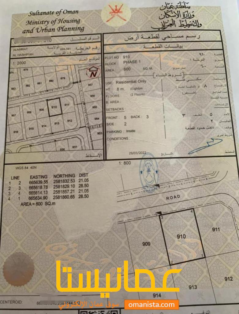 للبيع ارض سكنية ممتازة في العامرات الحشية الثانية وسطية ، رقم القطعة (910) .