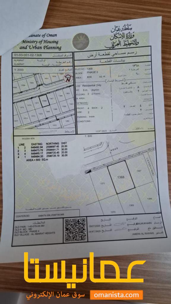 للبيع ارض سكنية ممتازة في مرتفعات العامرات الرابعة وسطية ، رقم القطعة (1368) .