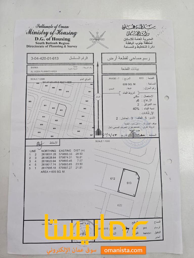 للبيع ارض سكنية ممتازة في بركاء العقدة السابعة كونر ، رقم القطعة (613) .