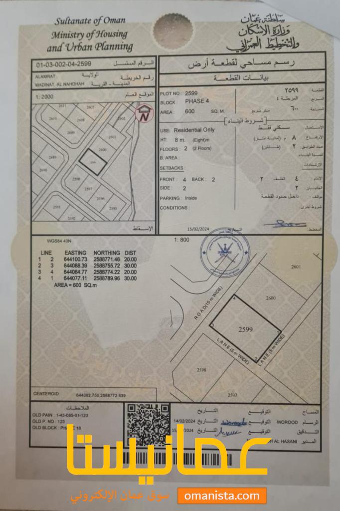 للبيع ارض سكنية ممتازة في العامرات مدينة النهضة 16، رقم القطعة (2599) .