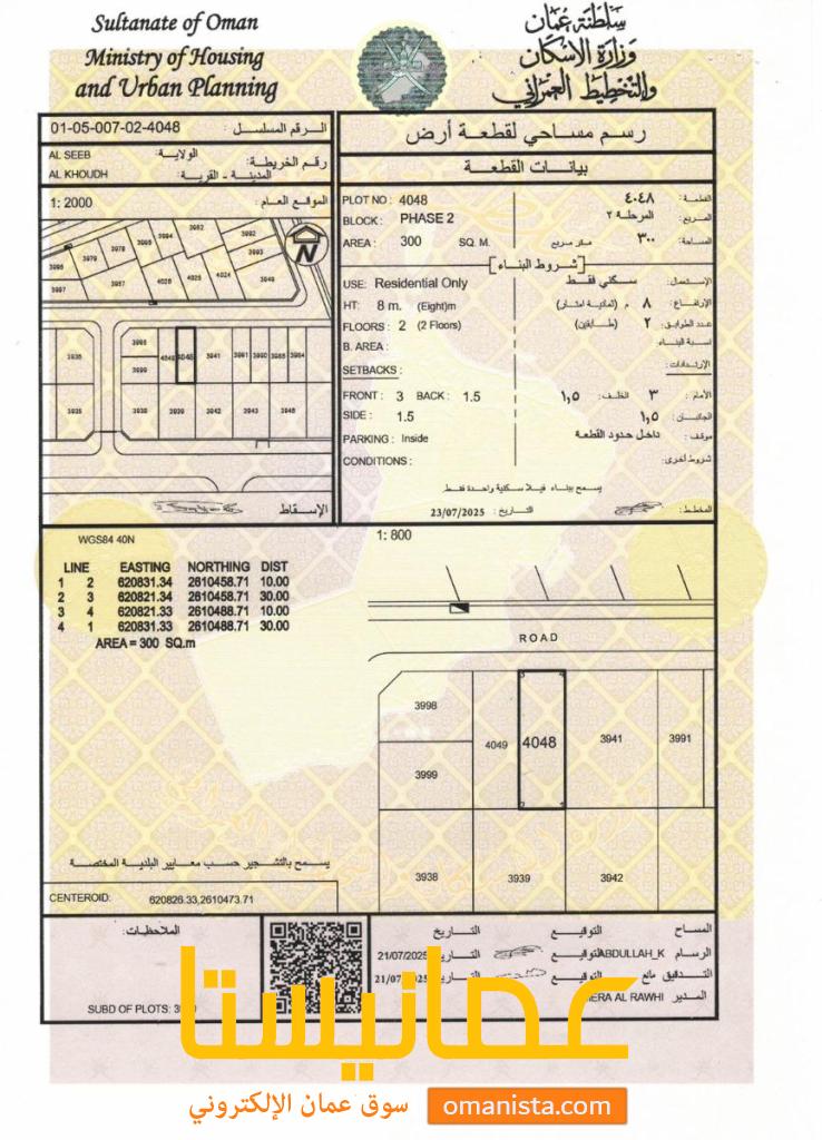 للبيع ارض سكنية ممتازة في الخوض 7 ، رقم القطعة (4048).