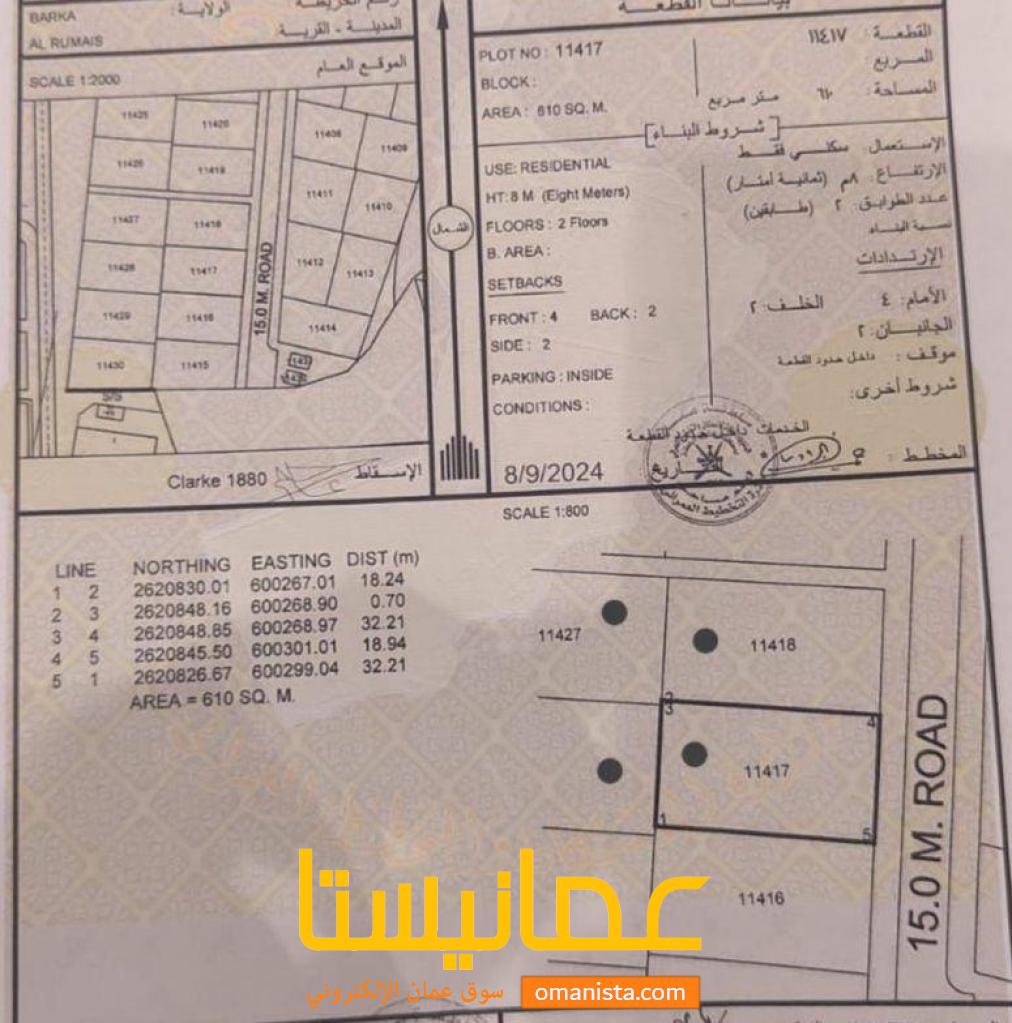 للبيع 4 اراضي شبك مميزة في بركاء الرميس شمال ، رقم القطعة (11417-11418-11427-11428) .