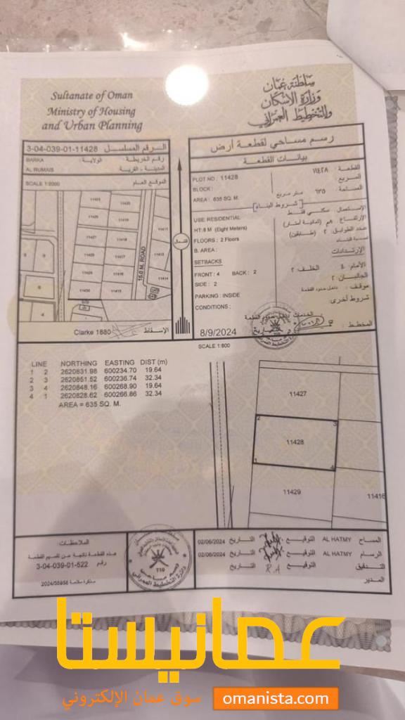 مساحة الارض 635 م² وسطية الخط الأول من طريق الباطنة الساحلي ،سهولة دخول والخروج منها ،مناسبه لعمل أستراحة أحلامك ، فرصة للأستثمار ، الارض مستوية وحولها المنازل القائمة و اخرى قيد الانشاء ، الخدمات متوفرة .