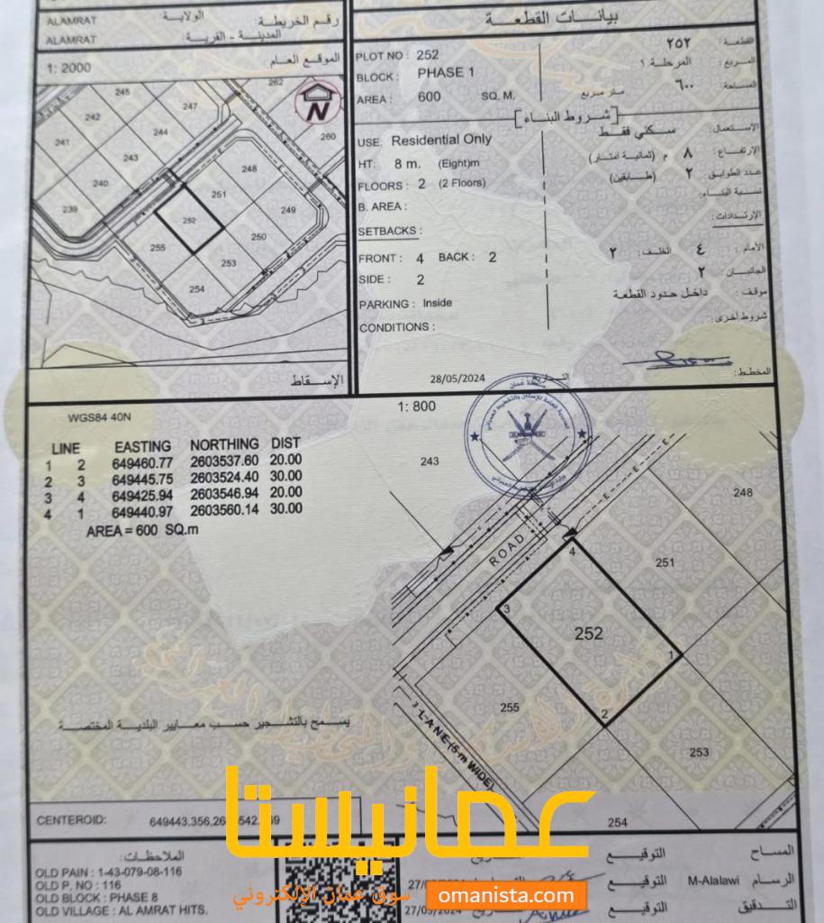 للبيع ارض سكنية ممتازة في مرتفعات العامرات 8 ، رقم القطعة (252) .