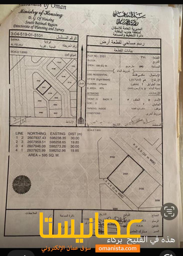 للبيع ارض سكنية ممتازة في بركاء الفليج المعمورة ، رقم القطعة (3101) .