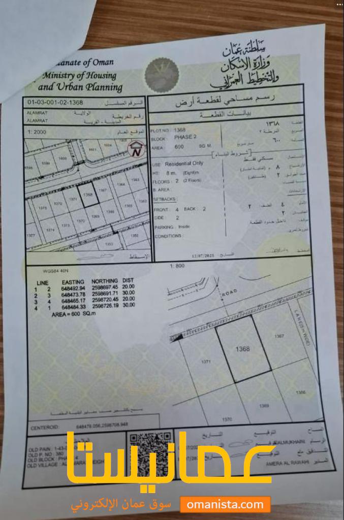 للبيع ارض سكنية ممتازة في مرتفعات العامرات 8 ، رقم القطعة (1368) .