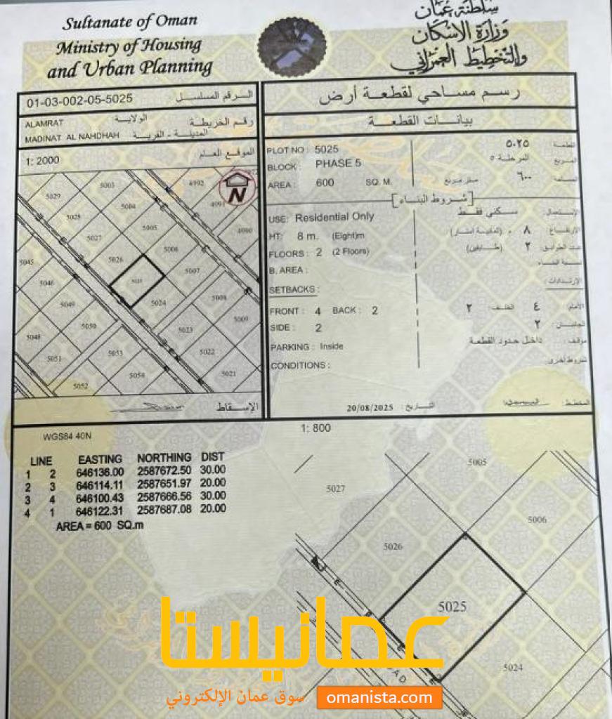 للبيع ارض سكنية ممتازة في العامرات مدينة النهضة 18، رقم القطعة (5025) .