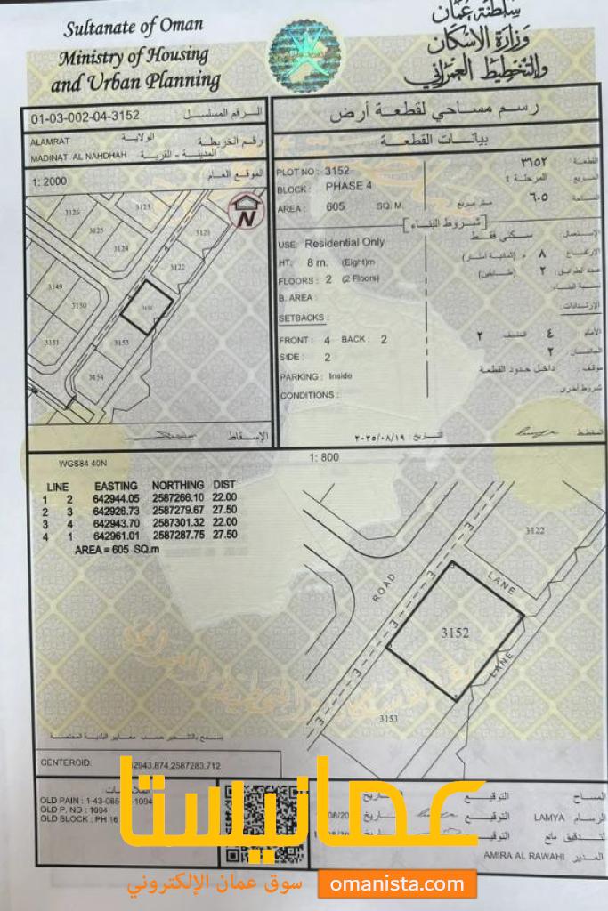 للبيع ارض سكنية ممتازة في العامرات مدينة النهضة 16 ، رقم القطعة (1094) .