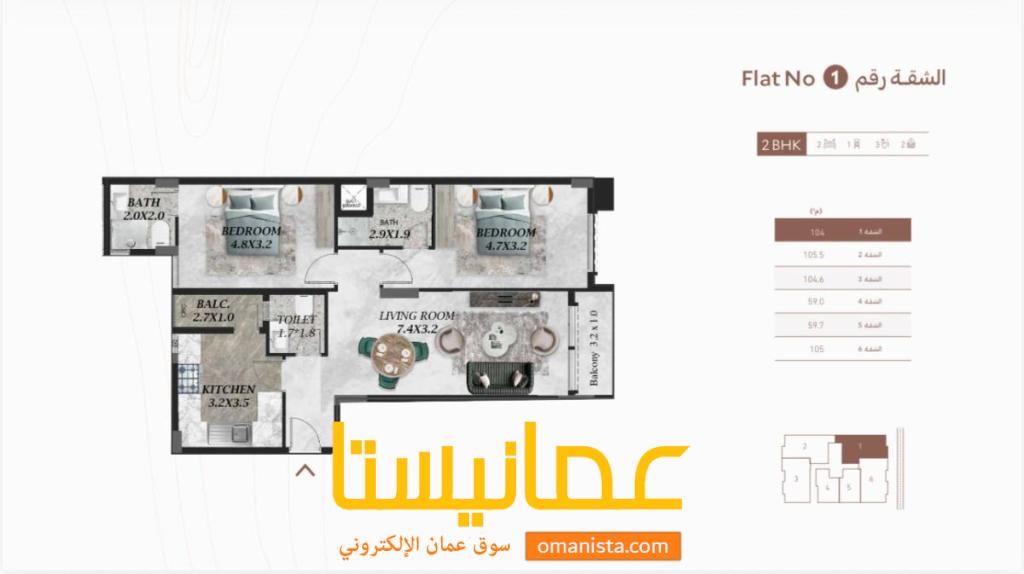 مساحه الشقه (104)م² في الطابق الرابع وتتكون من الاتى :