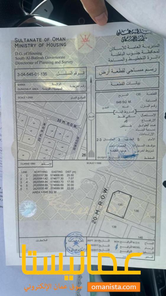 للبيع ارض سكنية ممتازة في بركاء القريحة الجديده الجنوب كونر رقم القطعة (135) .