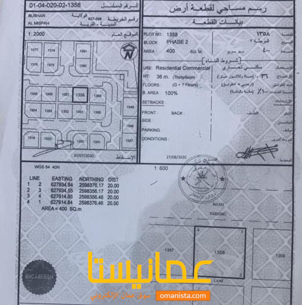 مساحة الارض 400 م² زاوية مفتوحه من ثلاث جهات ،ملازقة بناية وقريبة من شارع الخدمات ، وبجانب شركة بهوان اللوجستية ومن الخلف بالقرب من مخازن ديوان البلاط السلطاني ، مستوية و جاهزة للبناء ، حولها مباني تجارية قائمة واخرى قيد الانشاء ، الخدمات متوفرة.