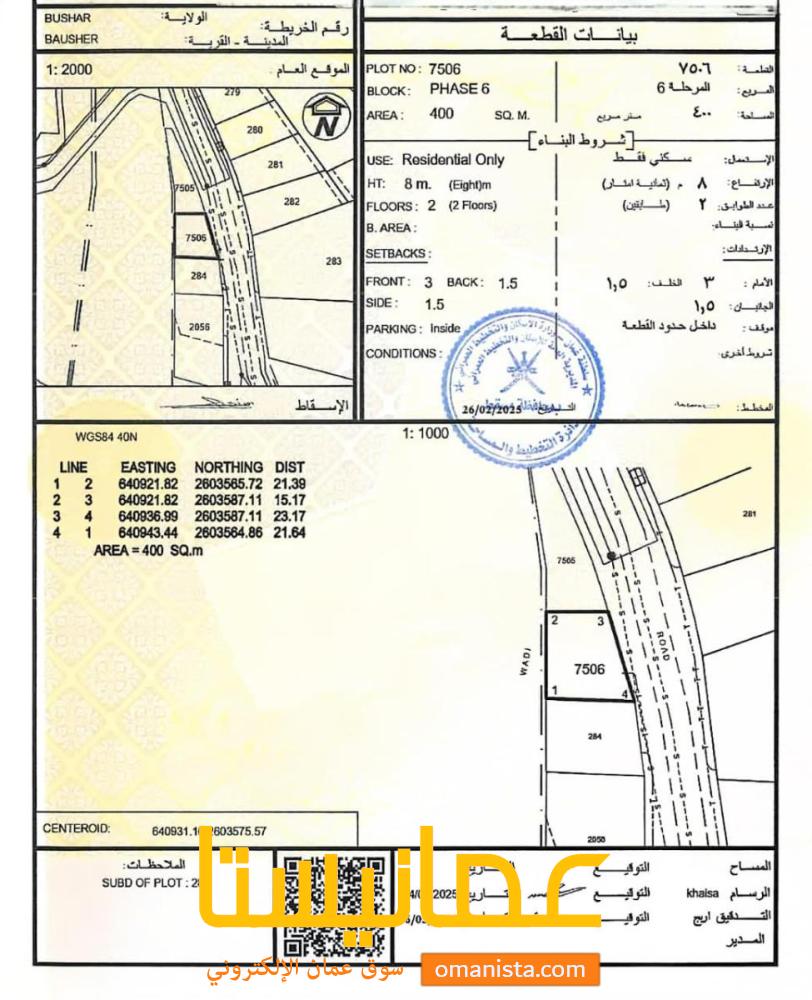 للبيع ارض سكنية ممتازة في بوشر بوشر السادسة وسطية رقم القطعة (7506) .