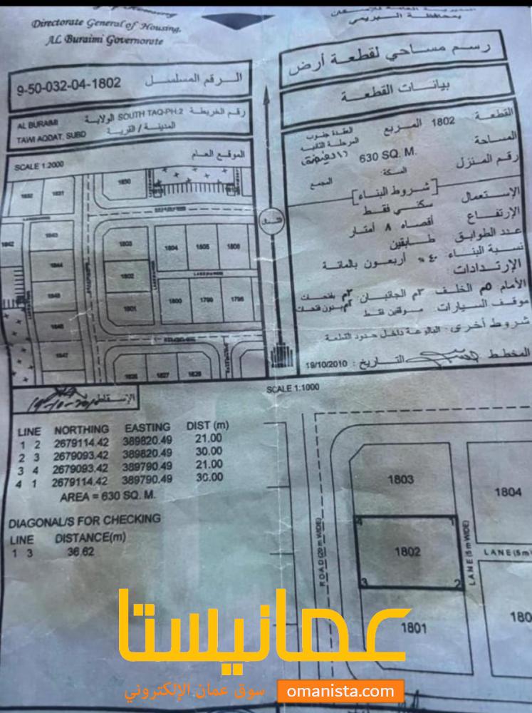 للبيع ارض سكنية ممتازة في البريمي العقدة الجنوب المرحله الثانية وسطية رقم القطعة (1802) .