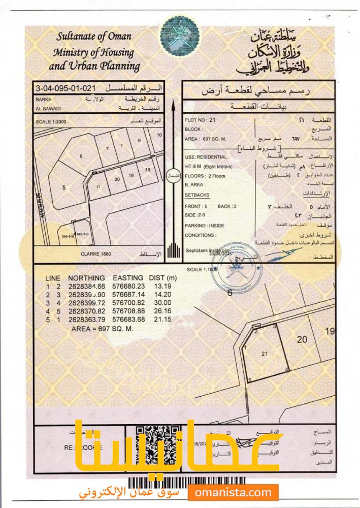 للبيع ارض سكنية ممتازة في بركاء السوادي الساحل كونر رقم القطعة (21) .