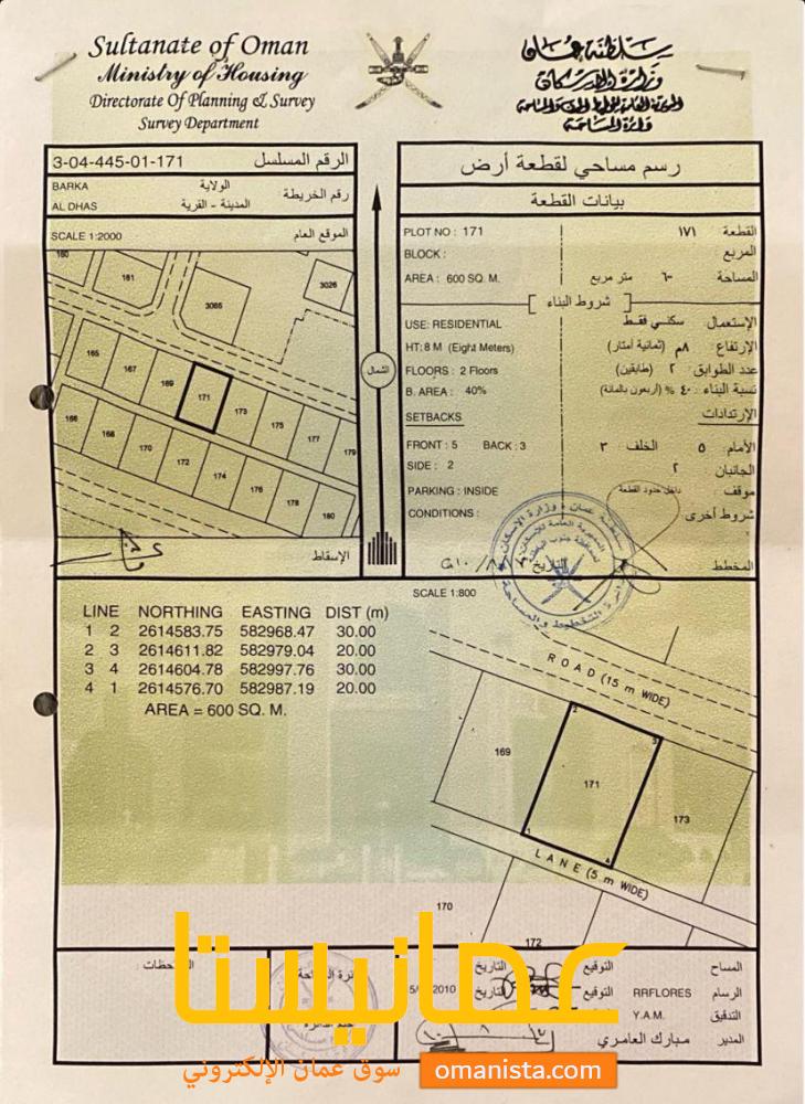 للبيع ارض سكنية ممتازة في بركاء الدهس وسطية رقم القطعة (171) .