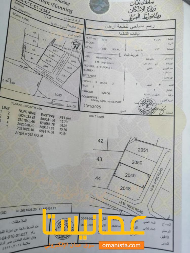 للبيع أرض سكنية ممتاز في بركاء الجنينه ،