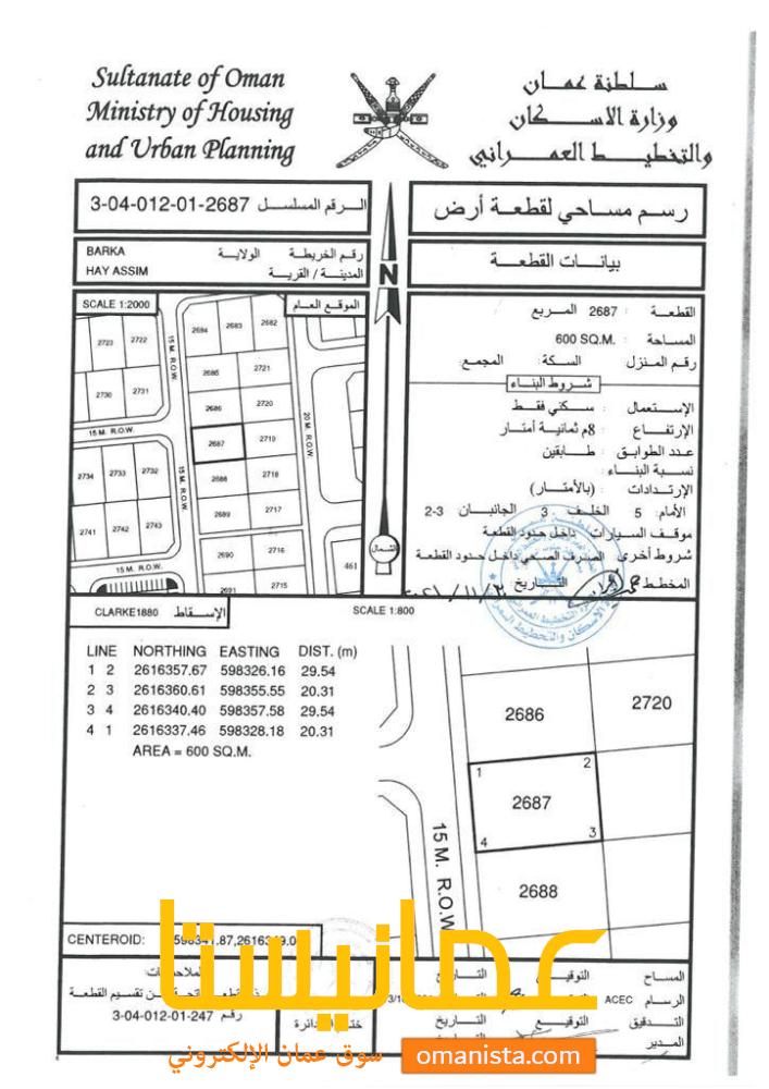 للبيع ارض سكنية ممتازة في بركاء حي عاصم جنوب سفاري وسطية رقم القطعة (2687) .