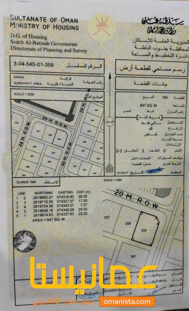 للبيع ارض سكنية ممتازة في بركاء القريحة الاولى الجديده كونر رقم القطعة (359) .