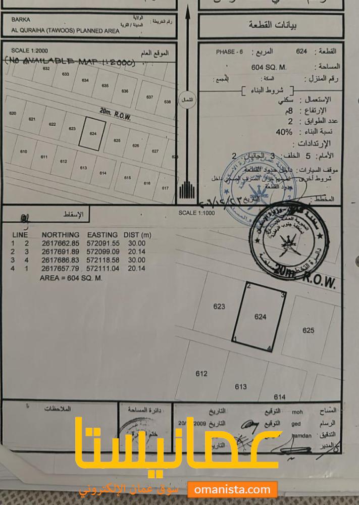 للبيع ارض سكنية ممتازة في بركاء القريحة 6 جنوب زاوية رقم القطعة (624) .