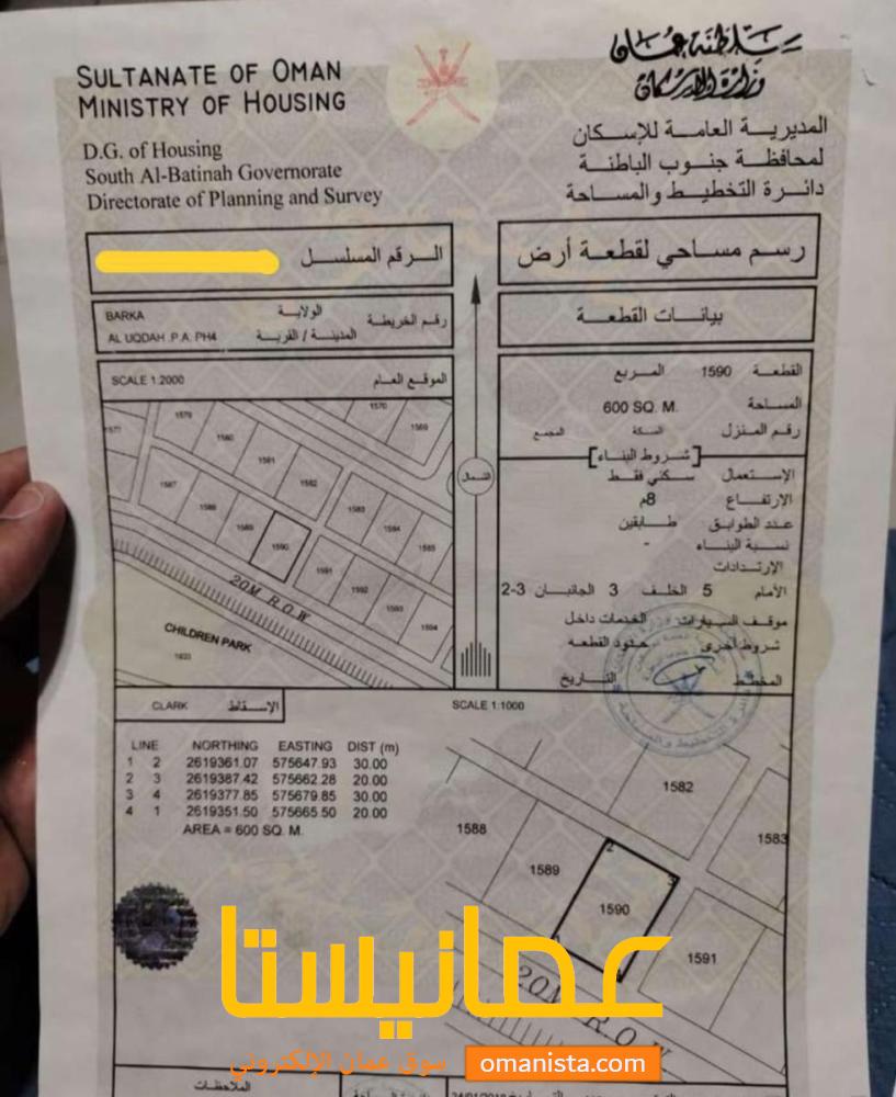 للبيع ارض سكنية ممتازة في بركاء العقدة 4 جنوب زاوية رقم القطعة (1590) .