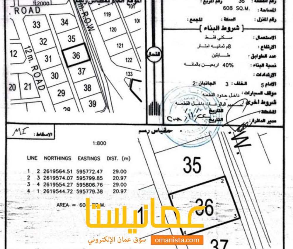 للبيع ارض سكنية ممتازة في بركاء حي عاصم شمال وسطية رقم القطعة (36) .