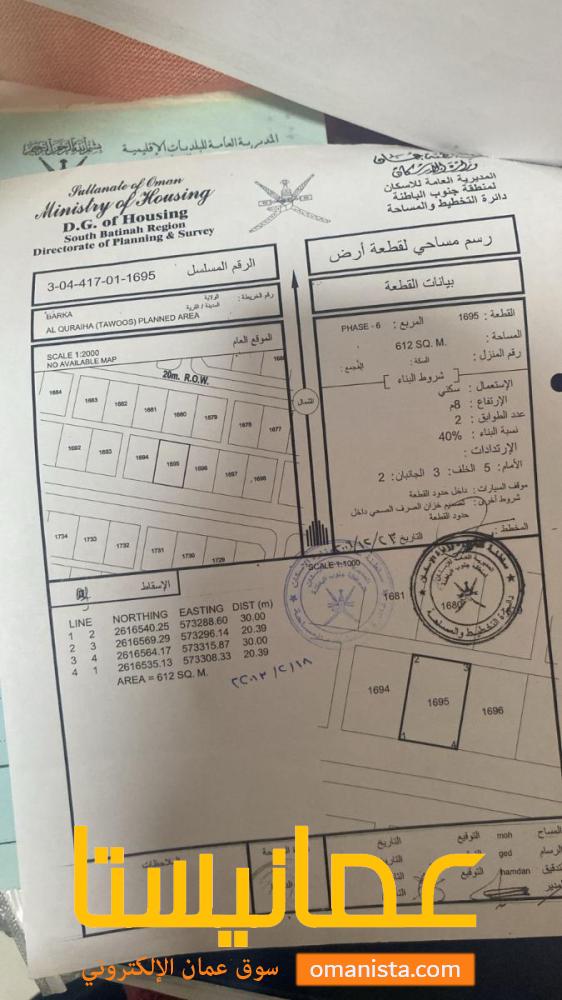 للبيع ارض سكنية ممتازة في بركاء القريحة 6 جنوب وسطية رقم القطعة (1695) .