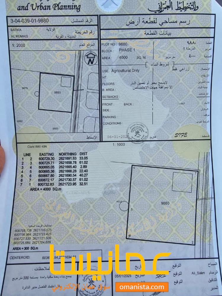 للبيع ارضان شبك زراعية وحدة سكنية ممتازة في بركاء الرميس ، رقم القطعة (9880-9879) .
