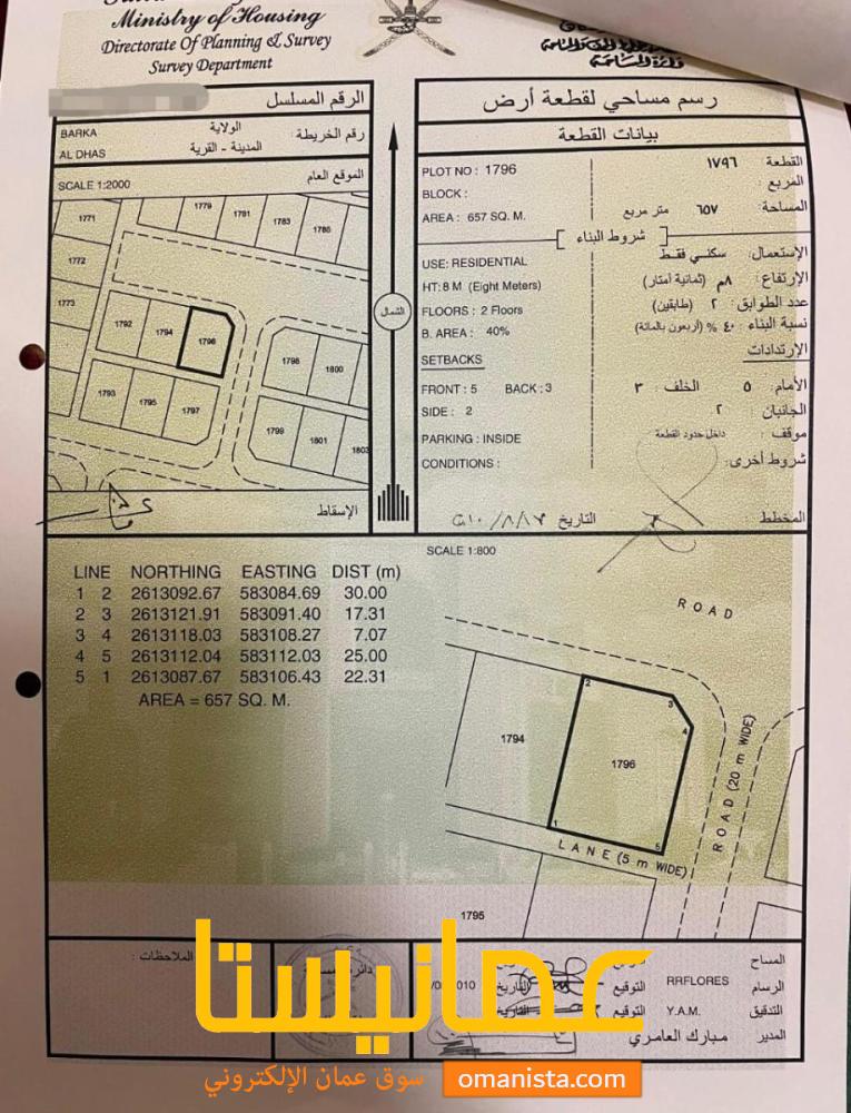للبيع ارض سكنية ممتازة في بركاء الدهس ، رقم القطعة (1796) .