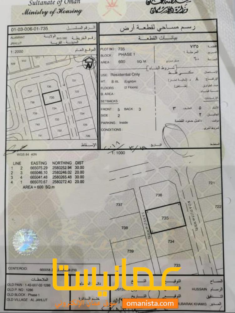 للبيع ارض سكنية ممتازة في العامرات جحلوت ، رقم القطعة (735) .
