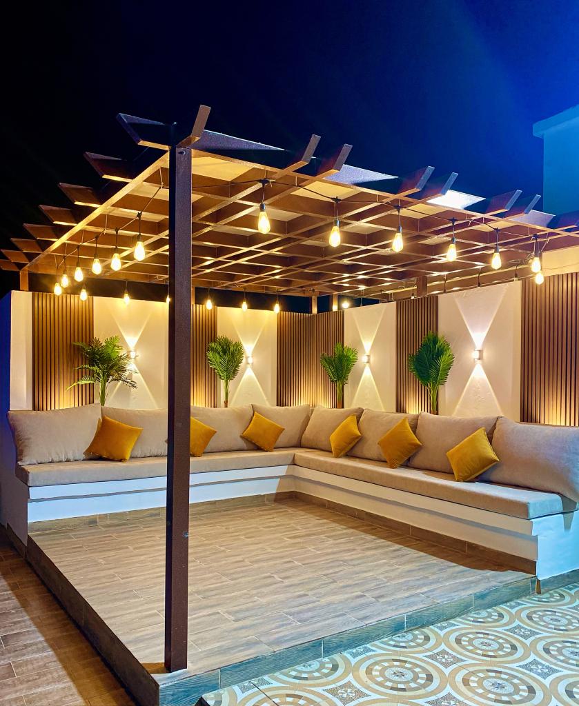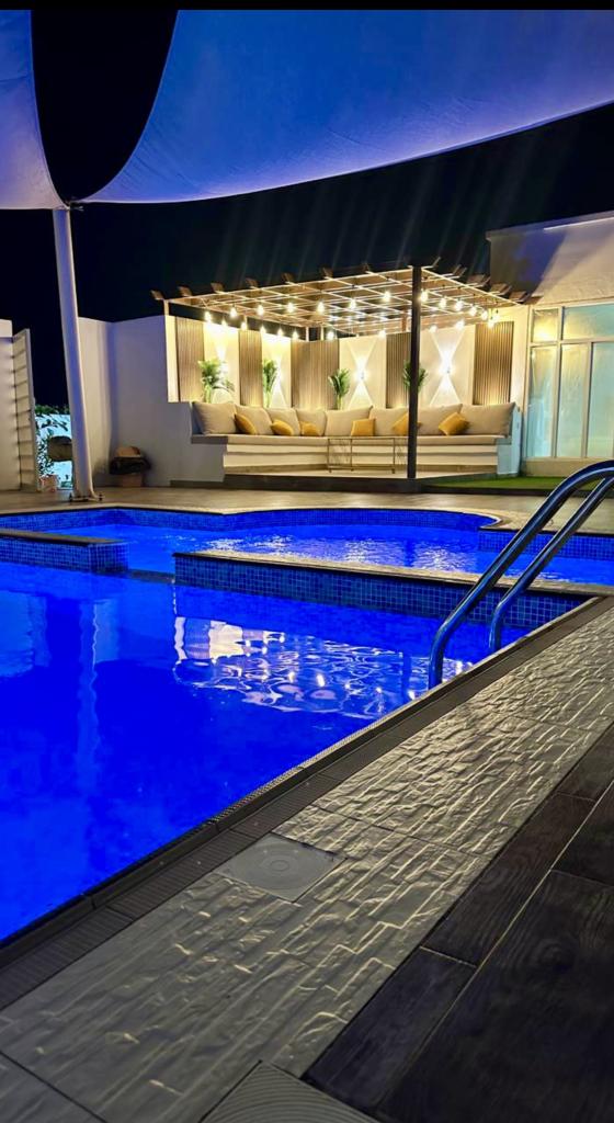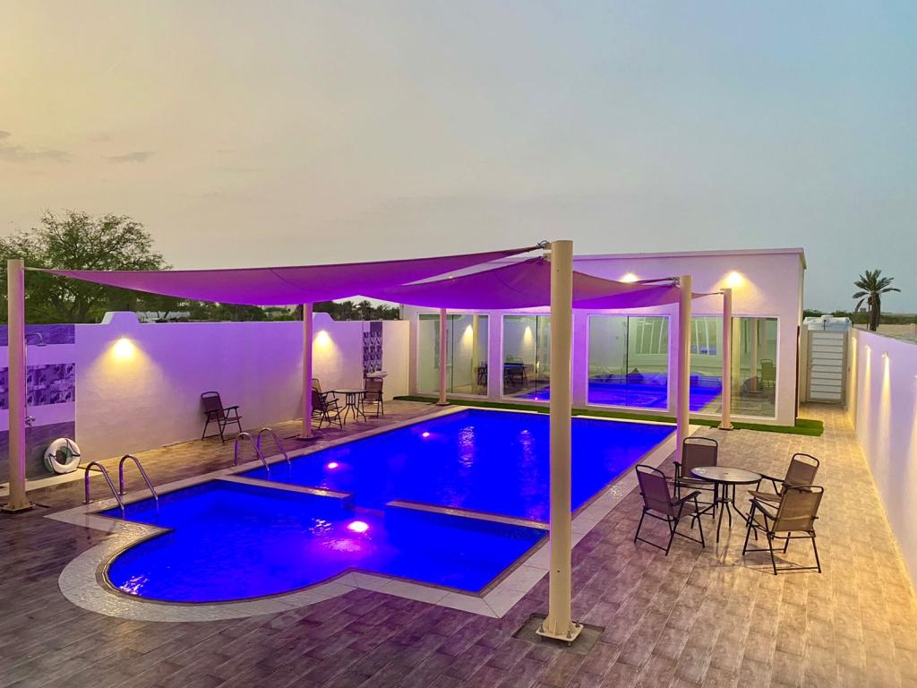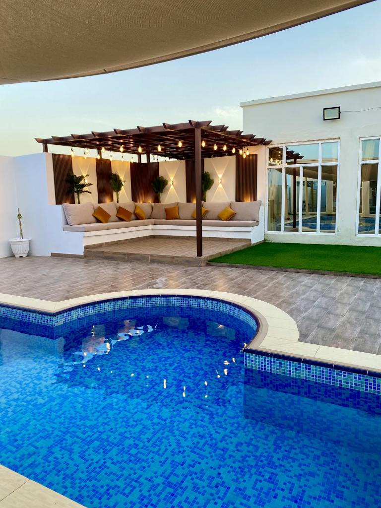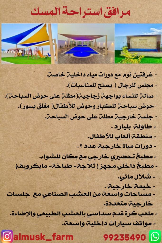 استراحة المسك لقضاء أجمل الأوقات تحتوي على حوض سباحة للكبار مغلق بسور للخصوصيه وحوض للاطفال مع صالة مطلة على الحوض بواجهة زجاجية وجلسة خارجية مطلة على الحوض و غرفتين نوم بدورات مياة خاصة و مجلس كبير مع شاشة تلفاز ومطبخ داخلي مجهز و ٢ دورات مياه خارجية مع منطقة ألعاب خاصة للأطفال و طاولة بليارد للكبار و حديقة خارجية مطلة على الغرف تحتوي على جلسات خارجية متنوعة وشلال مائي جداري و خيمة خارجية ومطبخ تحضيري خارجي مع مكان للشواء بالإضافة إلى ملعب كرة قدم واسع بالعشب الطبيعي مع الإضاءة ومواقف سيارات داخلية واسعة