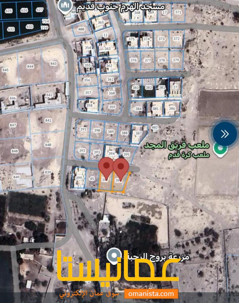 بركاء منطقة الهرم جنوب ارض كورنر و ارض وسطية في موقع جميل و مميز قريبة من الأحياء السكنية القائمة و المسجد و المزارع و الملعب و تبعد عن شارع السلطان قابوس حوال 1400 متر