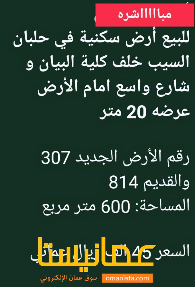 *للبيع أرض سكنية في حلبان السيب خلف كلية البيان و شارع واسع امام الأرض عرضه 20 متر*