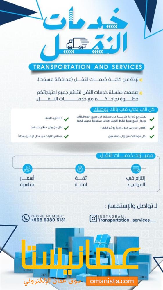 *مرحبا بكم نحن نقدم كافة خدمات النقل كل الي يجي ف بالك نوصلك(نقل جميع انواع بضائع ومنتجات من مسقط الى جميع محافظات في السلطنة ودول خليج إستلام طلبات من محل،المنزل مجانآ لـمشاريع تجارية،منزلية)(نقل موظفات من والى جهة عمل سيارة خاصة/سائق)(طلبيات لـمشاريع تجارية،منزلية)(مشاوير خاصة)(من والى مطار مسقط)(طلاب مدارس ولاية بوشر فقط)*✨🛍️