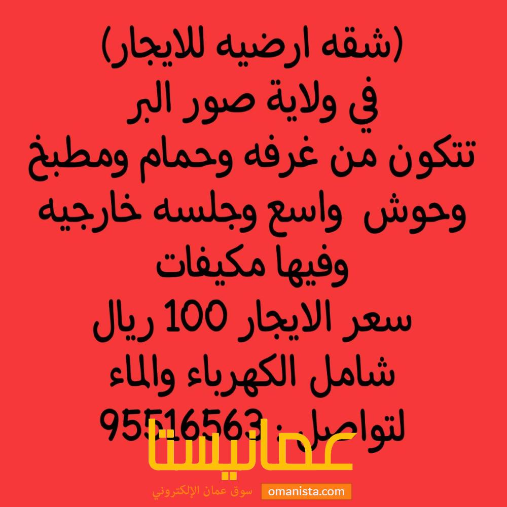Ground floor apartment for rent in Sur, Oman. It consists of one bedroom, one bathroom, a kitchen, a spacious yard, and an outdoor seating area. Air conditioning is included. Rent is 110 Omani Riyals, including electricity and water. Contact: 95516563