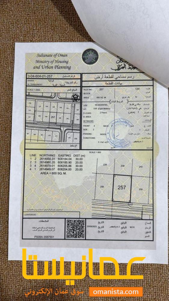مساحة الارض 600 م² ، وسطية على شارع امامي عرضه 20 متر ، خلف الجامعة الالمانية ،وبالقرب من طريق مسقط السريع ، حولها العديد من المنازل القائمة واخرى قيد الانشاء ، فرصة للأستثمار ، جميع الخدمات متوفرة .