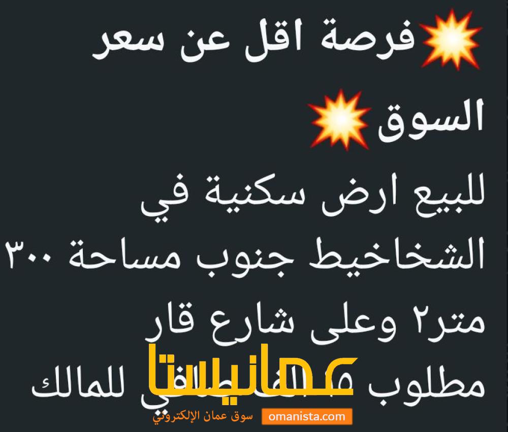 *🔥للبيع🔥* *💥فرصة اقل عن سعر السوق💥* للبيع ارض سكنية في الشخاخيط جنوب مساحة ٣٠٠ متر٢ وعلى شارع قار مطلوب ١٥ الف صافي للمالك https://omanreal.com/g/bdhqt 92180540